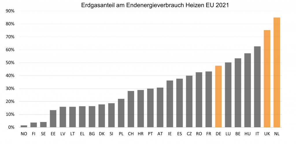 In Deutschland dagegen wurden 2024 ca. 56% aller Haushalte mit Erdgas versorgt [BDEW 2026]. In den Niederlanden wurden 2021 ca. 85% der Haushalte mit Erdgas versorgt (energie-nederland), es existierte sogar ein Anschlusszwang aller Haushalte an das Erdgasnetz, der mit dem Gas Act erst in 2020 aufgehoben wurde (iea).